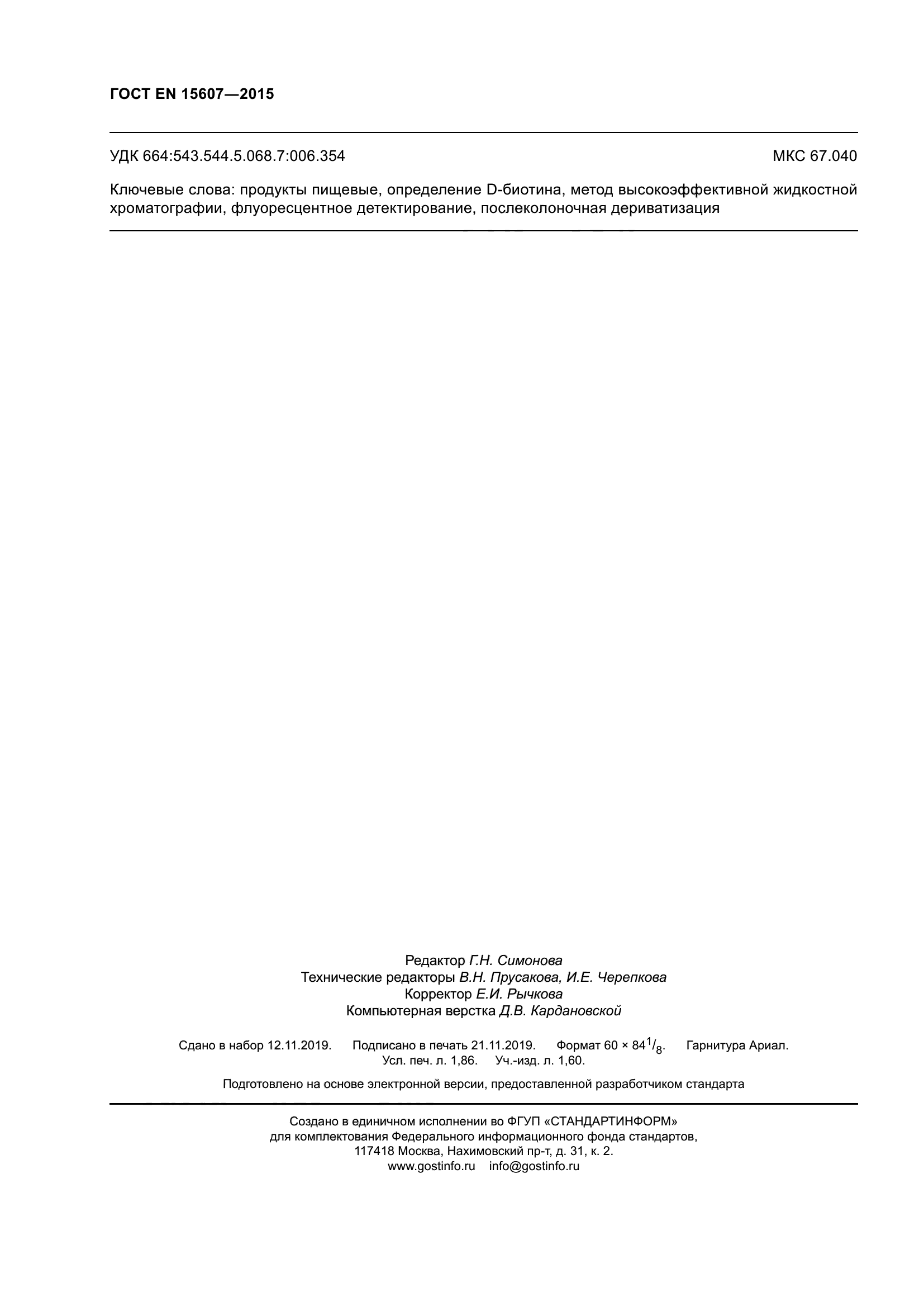 | Название рус.: | Продукты пищевые. Определение D-биотина методом высокоэффективной жидкостной хроматографии | | Дата актуализации текста: | 01.01.2026 | | Дата актуализации описания: | 01.01.2021 | | Дата регистрации: | 29.05.2015 | | Дата издания: | 21.11.2019 | | Дата введения: | 01.01.2017 | | Аутентичен стандартам: | EN 15607:2009 | | Нормативные ссылки: | EN ISO 3696 | | Область применения: | Настоящий стандарт устанавливает метод определения содержания D-биотина в пищевых продуктах методом высокоэффективной жидкостной хроматографии (ВЭЖХ). Метод прошел валидацию при межлабораторных сравнительных испытаниях с использованием как обогащенных проб, так и проб с естественным содержанием D-биотина, а именно концентратов типа сухого завтрака - мюсли, сухого молока для грудных детей, лиофилизированных зеленых овощей с ветчиной, лиофилизированного куриного бульона и обогащенного апельсинового сока в диапазоне значений содержания D-биотина от 16 до 200 мкг/100 г (см. Приложение В) | |