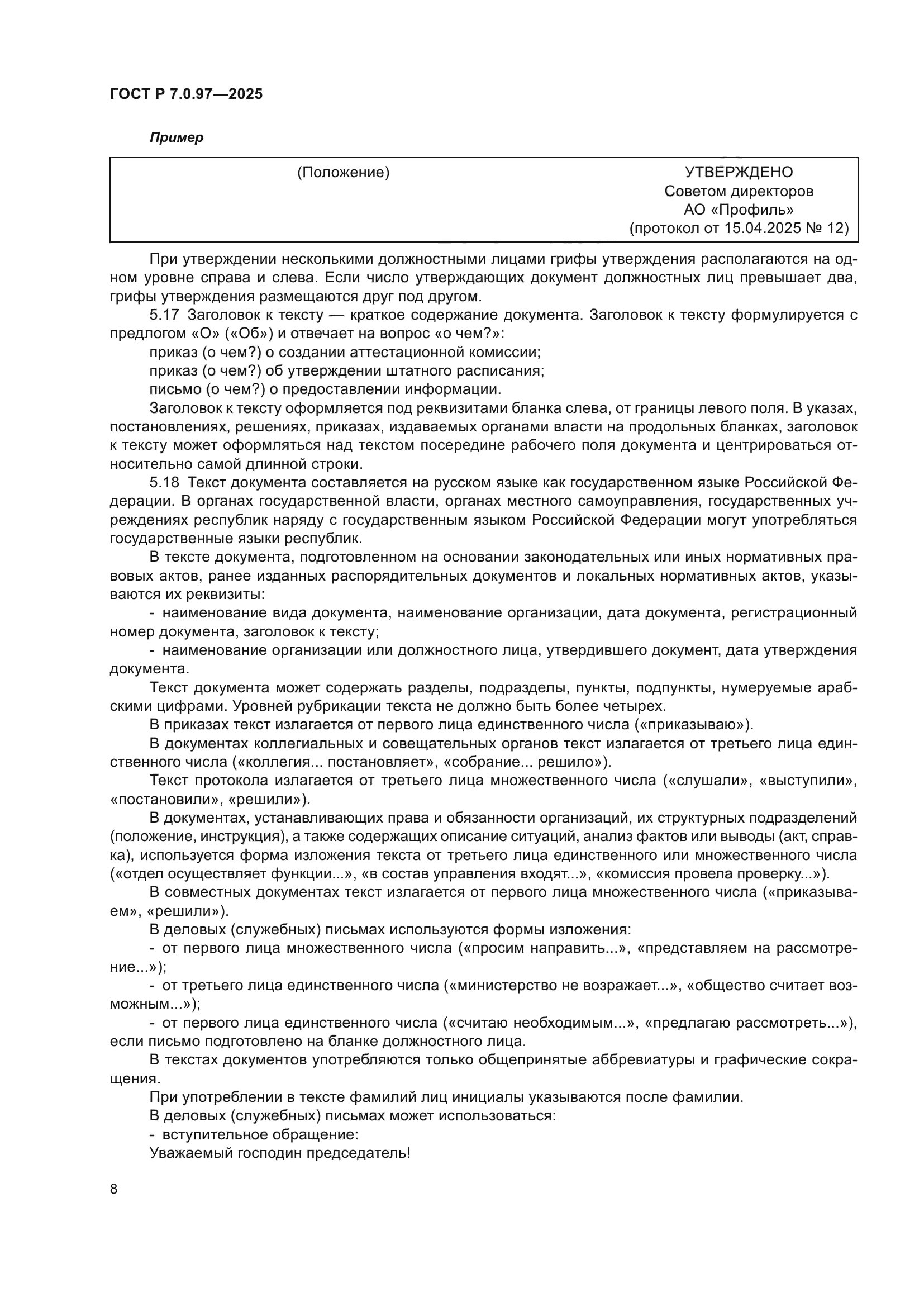 | Название рус.: | Система стандартов по информации, библиотечному и издательскому делу. Организационно-распорядительная документация. Требования к оформлению документов | | Название англ.: | System of standards on information, librarianship and publishing. Organizational and administrative documentation. Requirements for presentation of records | | Дата актуализации текста: | 01.01.2026 | | Дата актуализации описания: | 01.01.2026 | | Дата издания: | 07.07.2025 | | Дата введения: | 18.08.2025 | | Взамен: | ГОСТ Р 7.0.97-2016 | | Нормативные ссылки: | ГОСТ Р 51511; ГОСТ Р ИСО 15489-1;ОК 011-93 | | Область применения: | Настоящий стандарт распространяется на организационно-распорядительные документы: уставы, положения, правила, инструкции, регламенты, постановления, распоряжения, приказы, решения, протоколы, договоры, акты, письма, справки и др. (далее - документы), в том числе включенные в ОК 011-93, класс 0200000. Настоящий стандарт определяет состав реквизитов документов, правила их оформления, в том числе с применением информационных технологий; виды бланков, состав реквизитов бланков, схемы расположения реквизитов на документе; образцы бланков; правила создания документов. Положения настоящего стандарта распространяются на документы на бумажном и электронном носителях | |
