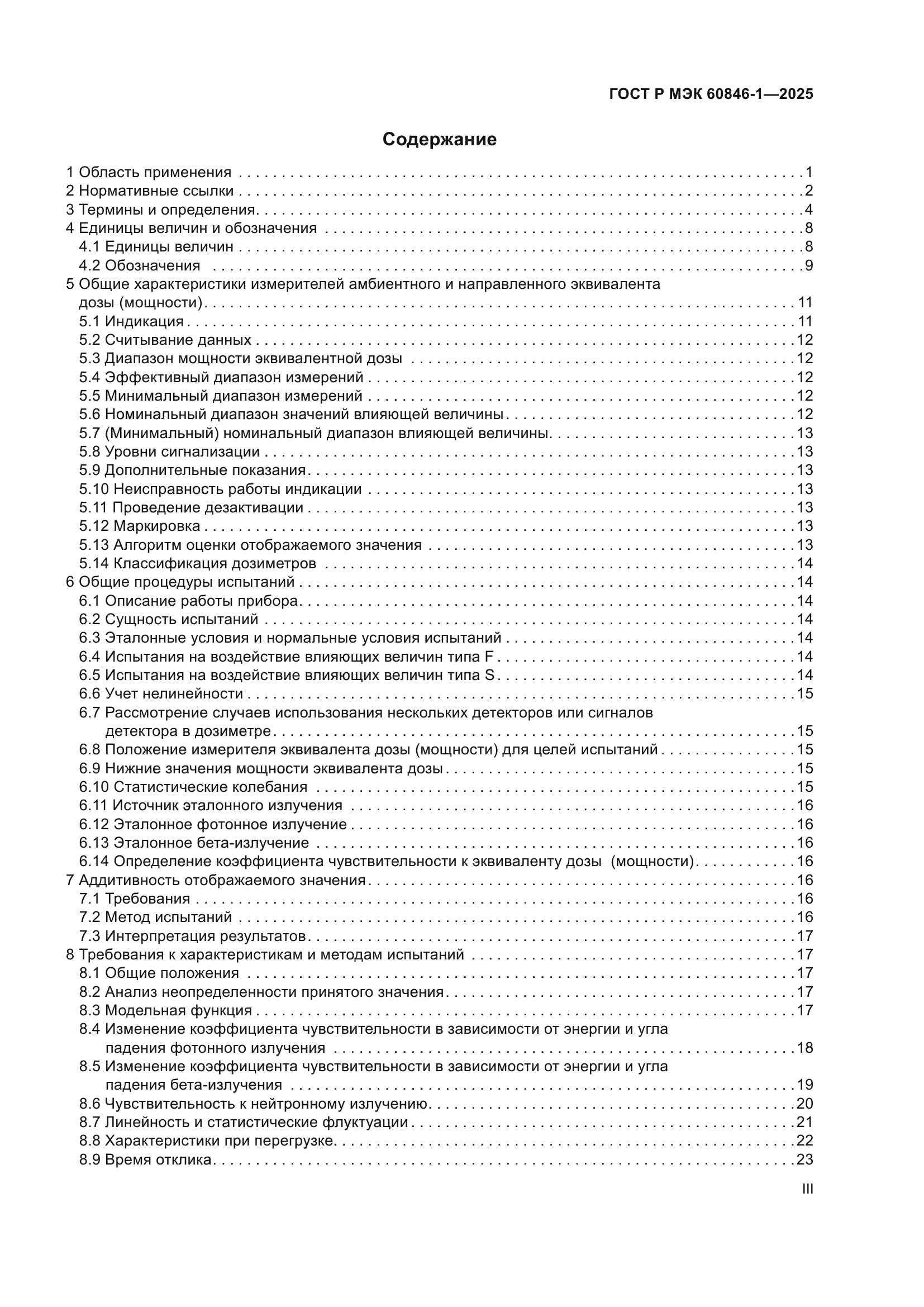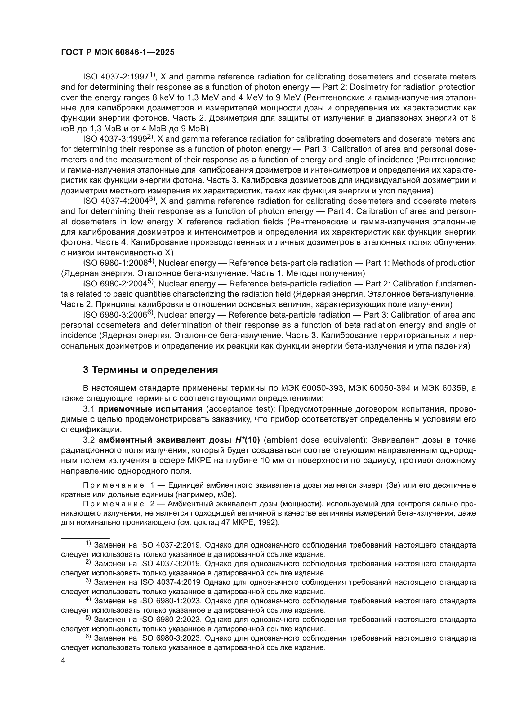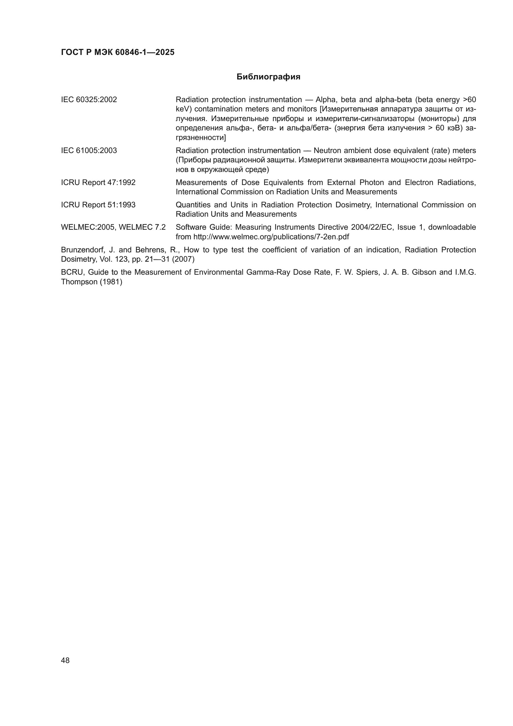 | Название рус.: | Приборы радиационной защиты. Измерители и/или измерители-сигнализаторы амбиентного и/или направленного эквивалента дозы (мощности) бета-, рентгеновского и гамма-излучений. Часть 1. Требования к переносным измерителям и измерителям-сигнализаторам для мониторинга рабочих мест и окружающей среды | | Название англ.: | Radiation protection instrumentation. Ambient and/or directional dose equivalent (rate) meters and/or monitors for beta, X and gamma radiation. Part 1. Requirements for portable workplace and environmental meters and monitors | | Дата актуализации текста: | 01.01.2026 | | Дата актуализации описания: | 01.01.2026 | | Дата издания: | 09.07.2025 | | Дата введения: | 01.08.2025 | | Аутентичен стандартам: | IEC 60846-1(2009) | | Нормативные ссылки: | ISO/IEC Guide 98-3:2008;ISO/IEC Guide 99:2007;ISO 4037-1:2019;ISO 4037-2:2019;ISO 4037-3:2019;ISO 4037-4:2019;ISO 6980-1:2023;ISO 6980-2:2023;ISO 6980-3:2023;IEC 60050-151(2001);IEC 60050-395(2014);IEC 60050-395(2014);IEC 60068-2-31(2008);IEC 60086-1(2021);IEC 60086-2(2021);IEC 60359(2001);IEC 60529(1989);IEC 61000-4-2(2008);IEC 61000-4-3(2020);IEC 61000-4-3(2006);IEC 61000-4-6(2023);IEC 61000-4-8(2009);IEC 61000-6-2(2016);IEC 61187(1993);IEC/TR 62461(2015) | | Область применения: | Настоящий стандарт применяется к измерителям и/или измерителям-сигнализаторам эквивалента дозы (мощности), предназначенным для измерений амбиентного и/или направленного эквивалента дозы (мощности) внешнего бета-, рентгеновского и гамма-излучений, как определено в докладе 47 МКРЕ. Настоящий стандарт распространяется только на переносные измерители и/или измерители-сигнализаторы, предназначенные для мониторинга рабочих мест и окружающей среды. Настоящий стандарт распространяется на измерители и/или измерители-сигнализаторы для измерений эквивалента дозы внешнего бета- и/или рентгеновского и гамма-излучений в диапазоне от 0,01 мк3в до 10 Зв или мощности эквивалента дозы в диапазоне от 0,01 мкЗв·ч–1 до 10 Зв·ч–1 для энергий, указанных в таблице 1. Все значения энергии являются средними значениями по отношению к преобладающей величине дозы. Если требуется использование других измеряемых величин, например кермы в воздухе или экспозиционной дозы фотонного излучения, настоящий стандарт также может быть применен с соответствующими поправками. В настоящем стандарте выражение «эквивалент дозы (мощности)» используют в тех случаях, когда положения данного стандарта применяют как к измерениям эквивалента дозы, так и к измерениям мощности эквивалента дозы. Целью настоящего стандарта является установление требований к конструкции и определение характеристик измерителей эквивалента дозы (мощности), предназначенных для измерений амбиентного эквивалента дозы (мощности) и направленного эквивалента дозы (мощности) излучения, как определено в докладе 47 МКРЕ. Таким образом, настоящий стандарт устанавливает: а) общие характеристики, функции и рабочие характеристики измерителей эквивалента дозы (мощности); b) методы испытаний, которые должны использоваться для определения соответствия требованиям настоящего стандарта. Использование данного типа измерителей эквивалента дозы (мощности) не противоречит законодательству об обеспечении единства измерений | |