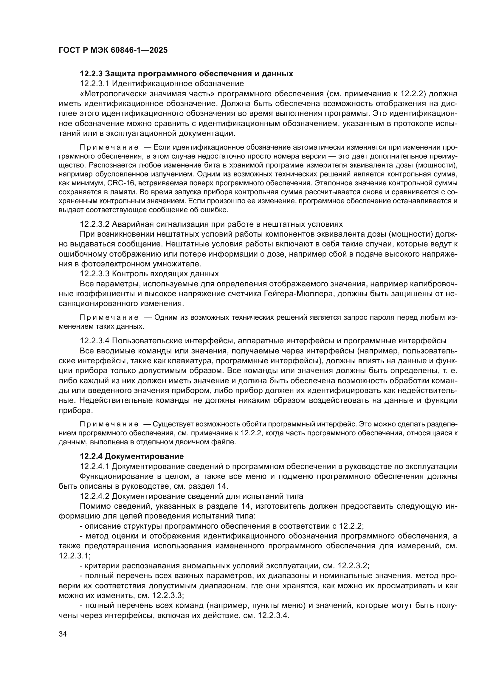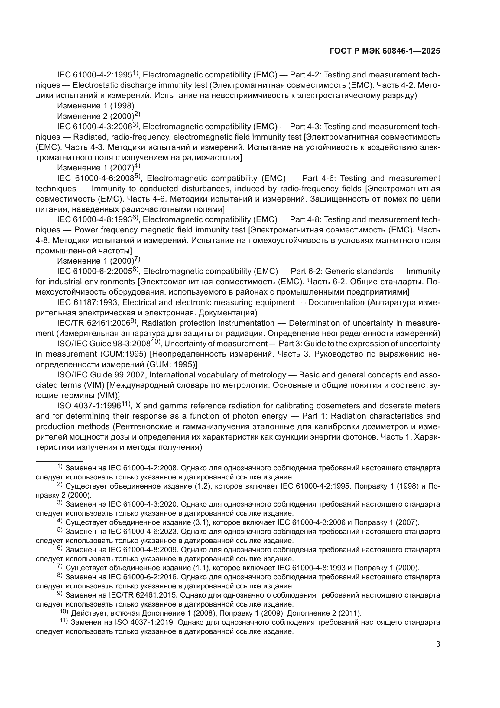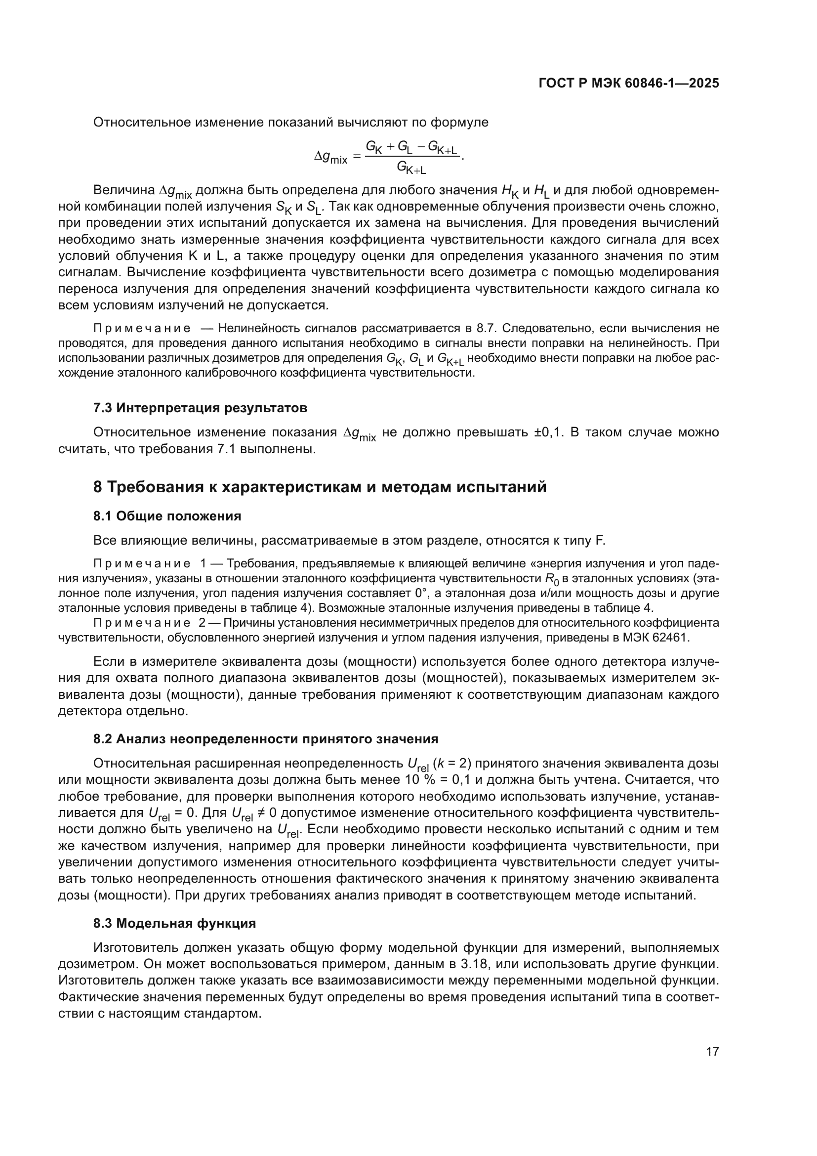 | Название рус.: | Приборы радиационной защиты. Измерители и/или измерители-сигнализаторы амбиентного и/или направленного эквивалента дозы (мощности) бета-, рентгеновского и гамма-излучений. Часть 1. Требования к переносным измерителям и измерителям-сигнализаторам для мониторинга рабочих мест и окружающей среды | | Название англ.: | Radiation protection instrumentation. Ambient and/or directional dose equivalent (rate) meters and/or monitors for beta, X and gamma radiation. Part 1. Requirements for portable workplace and environmental meters and monitors | | Дата актуализации текста: | 01.01.2026 | | Дата актуализации описания: | 01.01.2026 | | Дата издания: | 09.07.2025 | | Дата введения: | 01.08.2025 | | Аутентичен стандартам: | IEC 60846-1(2009) | | Нормативные ссылки: | ISO/IEC Guide 98-3:2008;ISO/IEC Guide 99:2007;ISO 4037-1:2019;ISO 4037-2:2019;ISO 4037-3:2019;ISO 4037-4:2019;ISO 6980-1:2023;ISO 6980-2:2023;ISO 6980-3:2023;IEC 60050-151(2001);IEC 60050-395(2014);IEC 60050-395(2014);IEC 60068-2-31(2008);IEC 60086-1(2021);IEC 60086-2(2021);IEC 60359(2001);IEC 60529(1989);IEC 61000-4-2(2008);IEC 61000-4-3(2020);IEC 61000-4-3(2006);IEC 61000-4-6(2023);IEC 61000-4-8(2009);IEC 61000-6-2(2016);IEC 61187(1993);IEC/TR 62461(2015) | | Область применения: | Настоящий стандарт применяется к измерителям и/или измерителям-сигнализаторам эквивалента дозы (мощности), предназначенным для измерений амбиентного и/или направленного эквивалента дозы (мощности) внешнего бета-, рентгеновского и гамма-излучений, как определено в докладе 47 МКРЕ. Настоящий стандарт распространяется только на переносные измерители и/или измерители-сигнализаторы, предназначенные для мониторинга рабочих мест и окружающей среды. Настоящий стандарт распространяется на измерители и/или измерители-сигнализаторы для измерений эквивалента дозы внешнего бета- и/или рентгеновского и гамма-излучений в диапазоне от 0,01 мк3в до 10 Зв или мощности эквивалента дозы в диапазоне от 0,01 мкЗв·ч–1 до 10 Зв·ч–1 для энергий, указанных в таблице 1. Все значения энергии являются средними значениями по отношению к преобладающей величине дозы. Если требуется использование других измеряемых величин, например кермы в воздухе или экспозиционной дозы фотонного излучения, настоящий стандарт также может быть применен с соответствующими поправками. В настоящем стандарте выражение «эквивалент дозы (мощности)» используют в тех случаях, когда положения данного стандарта применяют как к измерениям эквивалента дозы, так и к измерениям мощности эквивалента дозы. Целью настоящего стандарта является установление требований к конструкции и определение характеристик измерителей эквивалента дозы (мощности), предназначенных для измерений амбиентного эквивалента дозы (мощности) и направленного эквивалента дозы (мощности) излучения, как определено в докладе 47 МКРЕ. Таким образом, настоящий стандарт устанавливает: а) общие характеристики, функции и рабочие характеристики измерителей эквивалента дозы (мощности); b) методы испытаний, которые должны использоваться для определения соответствия требованиям настоящего стандарта. Использование данного типа измерителей эквивалента дозы (мощности) не противоречит законодательству об обеспечении единства измерений | |