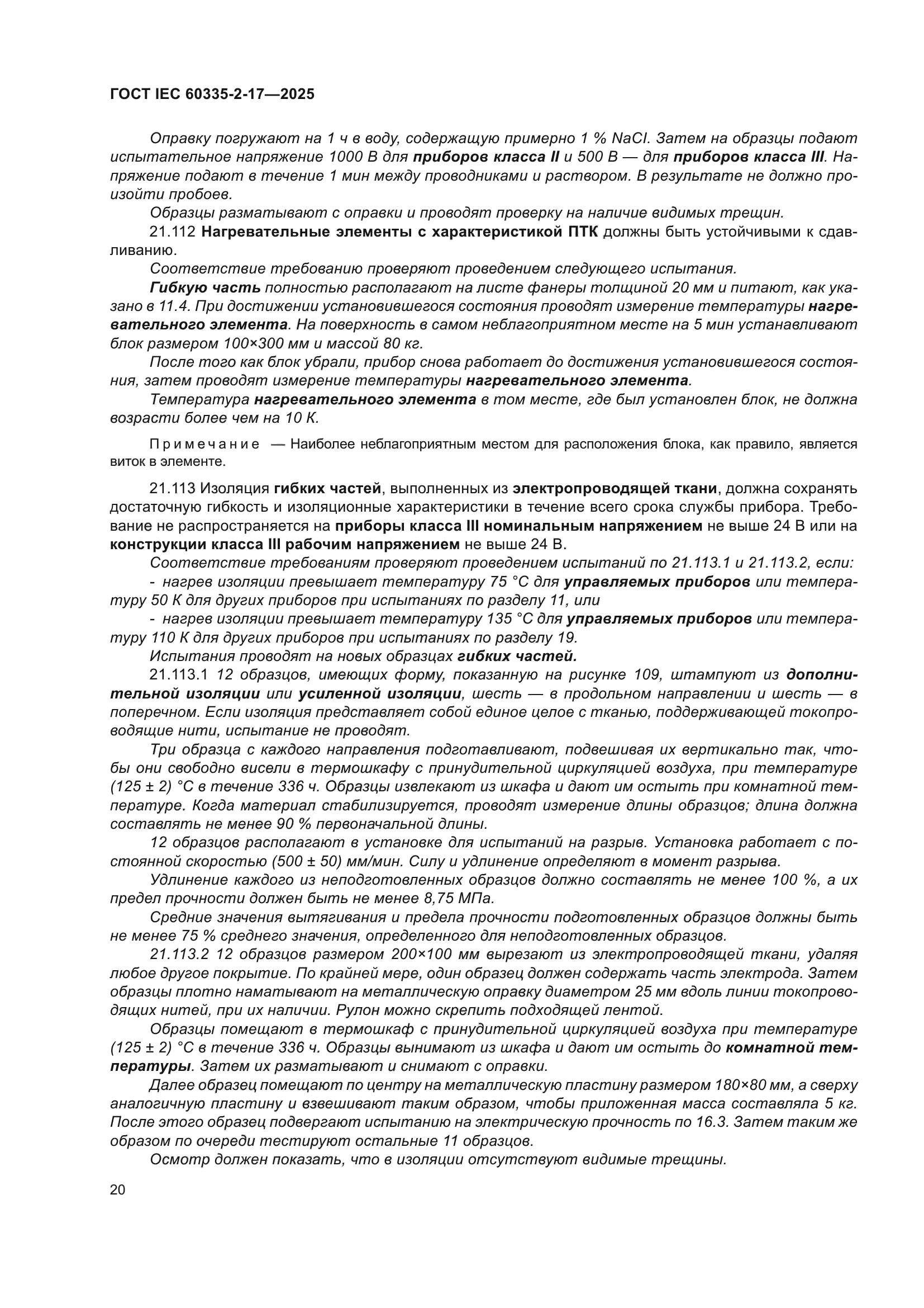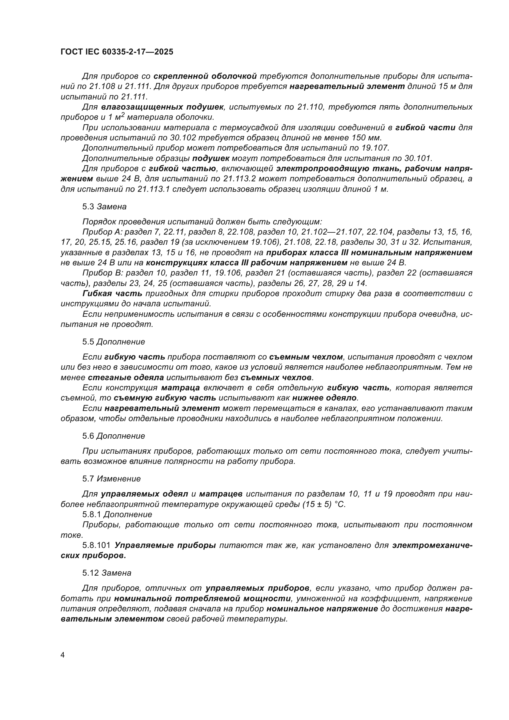 | Название рус.: | Бытовые и аналогичные электрические приборы. Безопасность. Часть 2-17. Частные требования к одеялам, подушкам, одежде и аналогичным гибким нагревательным приборам | | Название англ.: | Household and similar electrical appliances. Safety. Part 2-17. Particular requirements for blankets, pads, clothing and similar flexible heating appliances | | Дата актуализации текста: | 01.01.2026 | | Дата актуализации описания: | 01.01.2026 | | Дата регистрации: | 30.05.2025 | | Дата издания: | 21.07.2025 | | Дата введения: | 01.07.2026 | | Взамен: | ГОСТ IEC 60335-2-17-2014 | | Аутентичен стандартам: | IEС 60335-2-17(2022) | | Нормативные ссылки: | ISO/IEC Guide 37;ISO 2439;ISO 3758 | | Область применения: | Настоящий стандарт устанавливает требования безопасности электрических одеял, подушек, одежды и других гибких приборов, предназначенных для обогрева кровати или человеческого тела, бытового и аналогичного назначения номинальным напряжением не выше 250 В, включая приборы, питаемые постоянным током (DC), и приборы с батарейным питанием. Настоящий стандарт также распространяется на управляющие модули, поставляемые с прибором | |