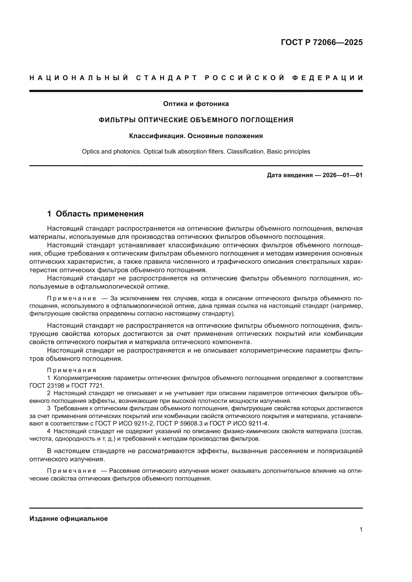 | Область применения: | Настоящий стандарт распространяется на оптические фильтры объемного поглощения, включая материалы, используемые для производства оптических фильтров объемного поглощения. Настоящий стандарт устанавливает классификацию оптических фильтров объемного поглощения, общие требования к оптическим фильтрам объемного поглощения и методам измерения основных оптических характеристик, а также правила численного и графического описания спектральных характеристик оптических фильтров объемного поглощения. Настоящий стандарт не распространяется на оптические фильтры объемного поглощения, используемые в офтальмологической оптике. Настоящий стандарт не распространяется на оптические фильтры объемного поглощения, фильтрующие свойства которых достигаются за счет применения оптических покрытий или комбинации свойств оптического покрытия и материала оптического компонента. Настоящий стандарт не распространяется и не описывает колориметрические параметры фильтров объемного поглощения |