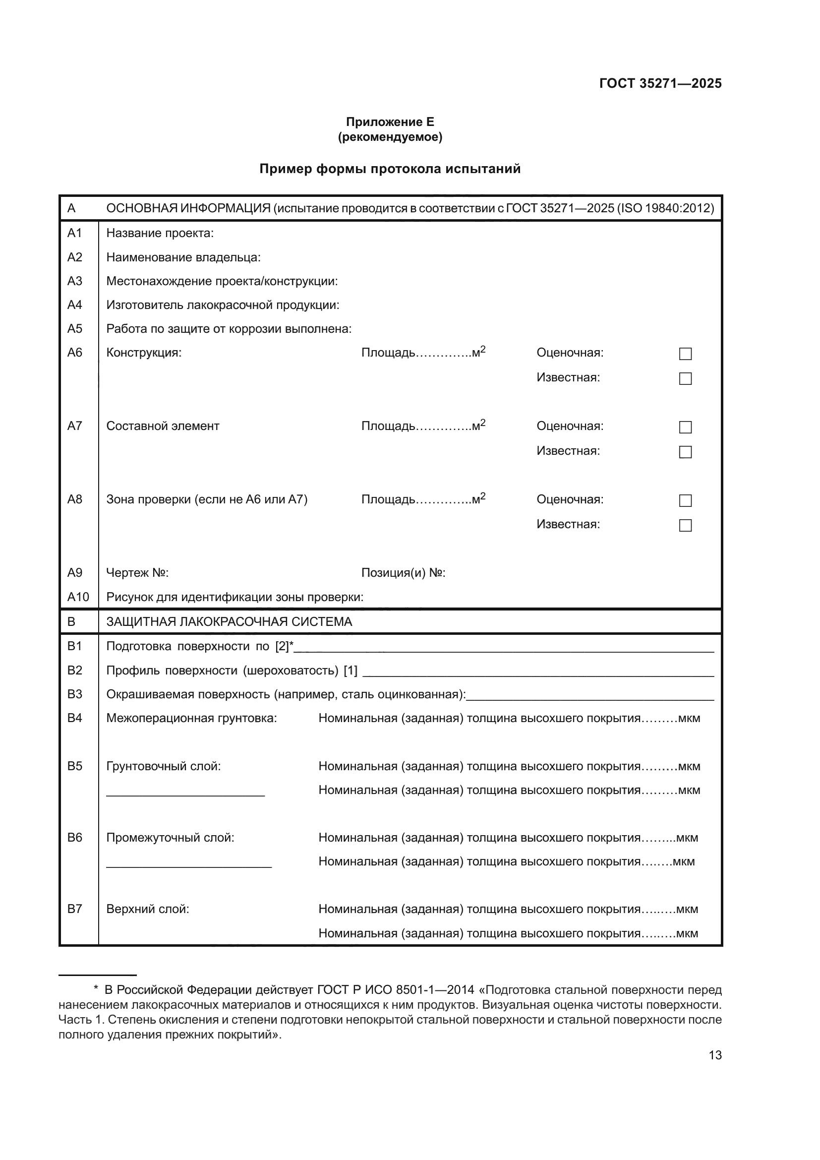 | Область применения: | Настоящий стандарт устанавливает методы определения толщины высохшего покрытия на шероховатых поверхностях по сравнению с номинальной толщиной, принятой для гладкой поверхности. Эти методы включают настройку используемого измерительного прибора, определение зоны проверки поверхности для измерения, план выборочного контроля, метод измерения и критерии соответствия или несоответствия. Настоящий стандарт применяют, если номинальная толщина высохшего покрытия составляет 40 мкм или более |