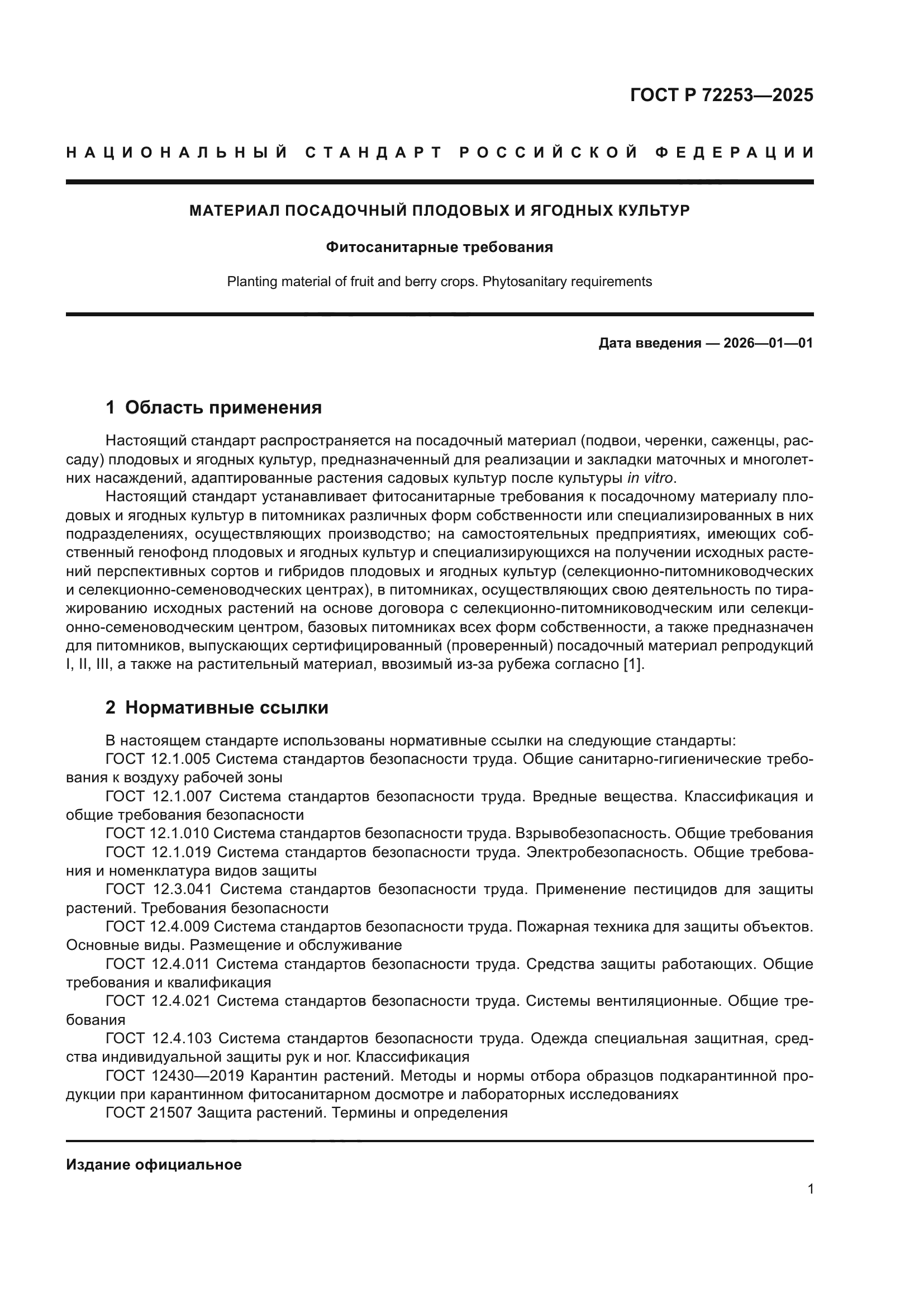 | Область применения: | Настоящий стандарт распространяется на посадочный материал (подвои, черенки, саженцы, рассаду) плодовых и ягодных культур, предназначенный для реализации и закладки маточных и многолетних насаждений, адаптированные растения садовых культур после культуры in vitro. Настоящий стандарт устанавливает фитосанитарные требования к посадочному материалу плодовых и ягодных культур в питомниках различных форм собственности или специализированных в них подразделениях, осуществляющих производство; на самостоятельных предприятиях, имеющих собственный генофонд плодовых и ягодных культур и специализирующихся на получении исходных растений перспективных сортов и гибридов плодовых и ягодных культур (селекционно-питомниководческих и селекционно-семеноводческих центрах), в питомниках, осуществляющих свою деятельность по тиражированию исходных растений на основе договора с селекционно-питомниководческим или селекционно-семеноводческим центром, базовых питомниках всех форм собственности, а также предназначен для питомников, выпускающих сертифицированный (проверенный) посадочный материал репродукций I, II, III, а также на растительный материал, ввозимый из-за рубежа согласно [1] |
