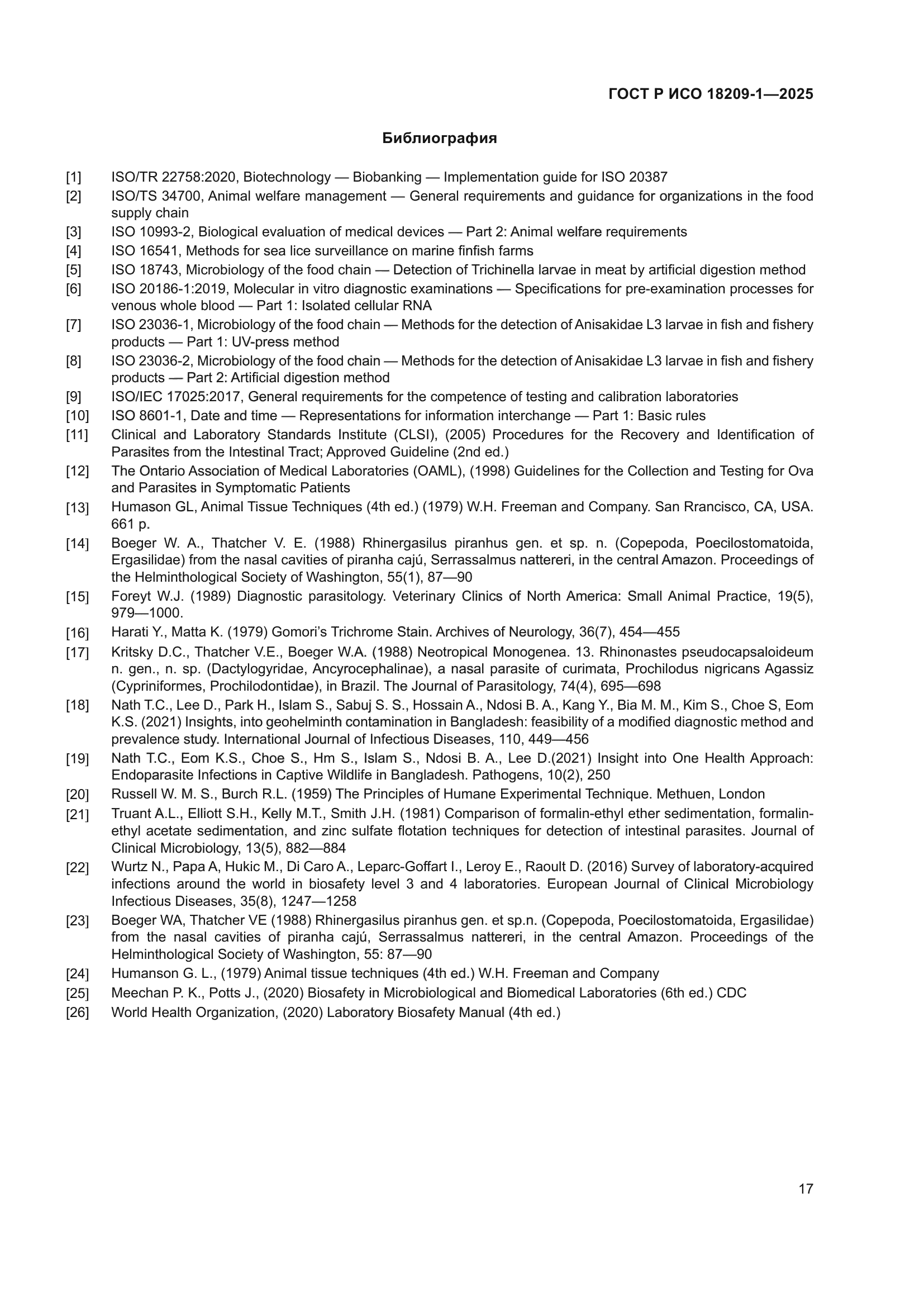 | Название рус.: | Биотехнология. Биобанкинг паразитов. Часть 1. Гельминты | | Название англ.: | Biotechnology. Biobanking of parasites. Part 1. Helminths | | Дата актуализации текста: | 01.01.2026 | | Дата актуализации описания: | 01.01.2026 | | Дата введения: | 01.03.2026 | | Аутентичен стандартам: | ISO 18209-1:2024 | | Нормативные ссылки: | ISO 15190:2020;ISO 21710:2020;ISO 24088-1;ISO 35001;ISO 45001:2018;IEC 61010-1 | | Область применения: | Настоящий стандарт устанавливает требования к биобанкингу гельминтов, которые рассматриваются как паразитарные ресурсы, включая сбор, обеспечение сохранности, классификацию, пролиферацию, консервацию, хранение и распространение гельминтов. Настоящий стандарт устанавливает требования к качеству гельминтов и связанных с ними данных, сбору данных и соблюдению техники безопасности при обращении с гельминтами как с источником возникновения инфекционных заболеваний человека. Настоящий стандарт может быть применен любыми организациями, осуществляющими биобанкинг (биобанкирование) гельминтов, используемых для научных исследований и разработок | |