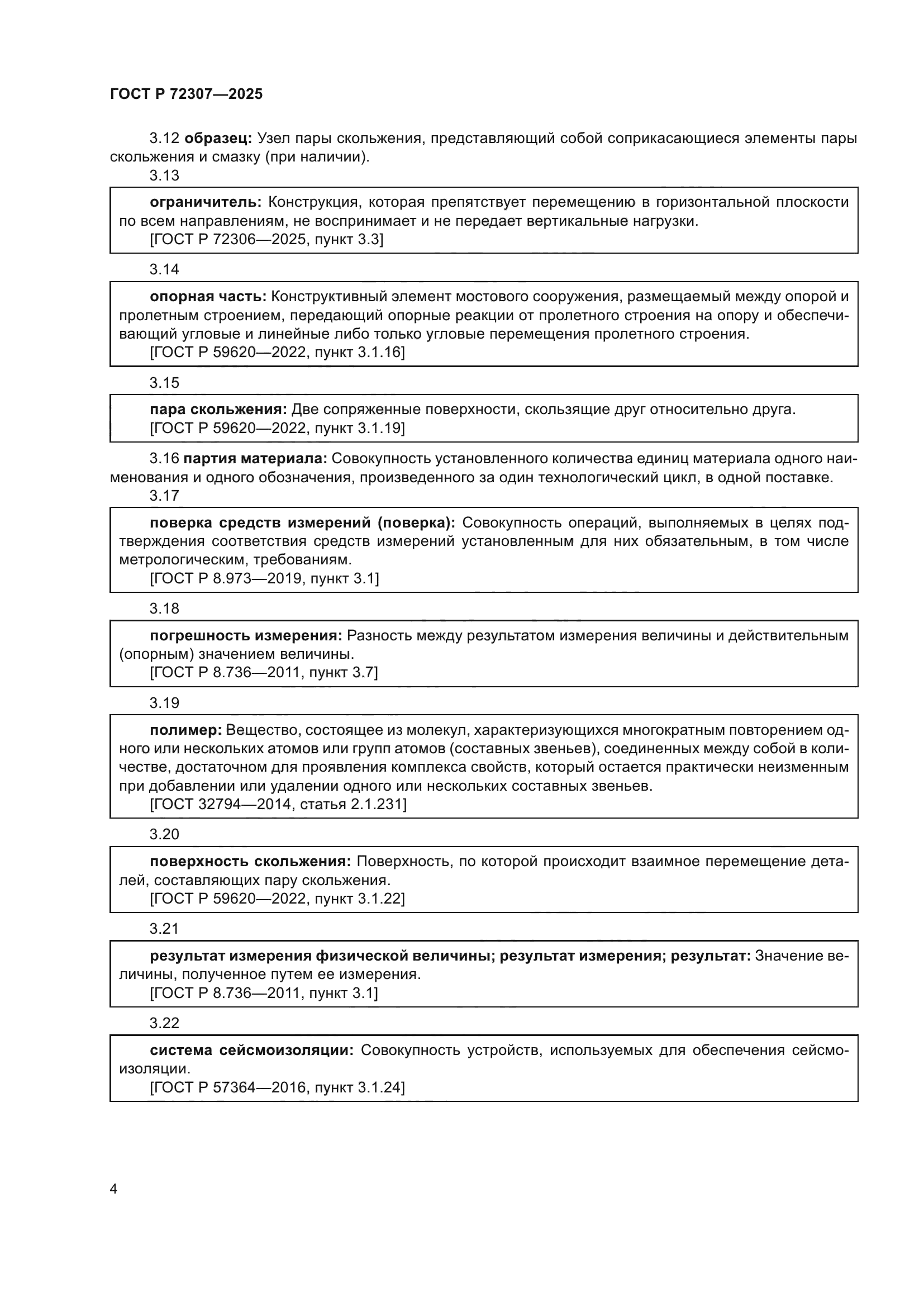 | Область применения: | Настоящий стандарт распространяется на определительные квалификационные, контрольные периодические и контрольные предъявительские испытания. Настоящий стандарт устанавливает следующие методы определения физических параметров пар скольжения: - допустимое давление на пару скольжения; - статический и динамический коэффициенты трения; - износ при прохождении парой скольжения заданного накопленного пути скольжения. Настоящий стандарт распространяется на методы определения физических параметров пар скольжения, применяемые в устройствах: - опорных частях для мостовых сооружений, расположенных на автомобильных дорогах общего пользования; - направляющих и ограничителях перемещений пролетных строений мостовых сооружений, расположенных на автомобильных дорогах общего пользования. Настоящий стандарт распространяется исключительно на лабораторные стендовые испытания. Настоящий стандарт распространяется на методы определения физических параметров пар скольжения, состоящих из антифрикционного материала и специально обработанного металла, как со смазкой, так и без нее, применимые при среднем давлении на пару скольжения от нормативных постоянных нагрузок и воздействий не менее 5 МПа. 1.6 Настоящий стандарт не распространяется на методы определения физических параметров пар скольжения, в составе которых отсутствуют антифрикционные материалы или две сопрягаемые поверхности скольжения изготовлены из антифрикционных материалов. Настоящий стандарт не распространяется на методы определения физических параметров пар скольжения, входящие в состав: - опорных частей, направляющих и ограничителей перемещений, воспринимающих знакопеременные вертикальные нагрузки; - устройств, в которых хотя бы один из элементов пары скольжения установлен непосредственно на эластомерный материал; - опорных частей, направляющих и ограничителей перемещений, применяемых в качестве технологических элементов на этапах строительства, капитального ремонта, ремонта и реконструкции мостового сооружения; - опорных частей, направляющих и ограничителей перемещений, применяемых в конструкциях разводных пролетных строений мостов; - любых устройствах системы сейсмоизоляции. Настоящий стандарт не распространяется на методы определения физико-механических, химических и других свойств материалов, применяемых в парах скольжения. Настоящий стандарт не распространяется на методы определения физических параметров пар скольжения при эксплуатации в агрессивных средах и при действии нагрузок и воздействий, не указанных в ГОСТ 33390. Результаты определения физических параметров пар скольжения, полученные по методам испытаний, указанным в данном стандарте, могут быть использованы для устройств, применяемых для регионов с расчетной сейсмичностью до 9 баллов включительно |