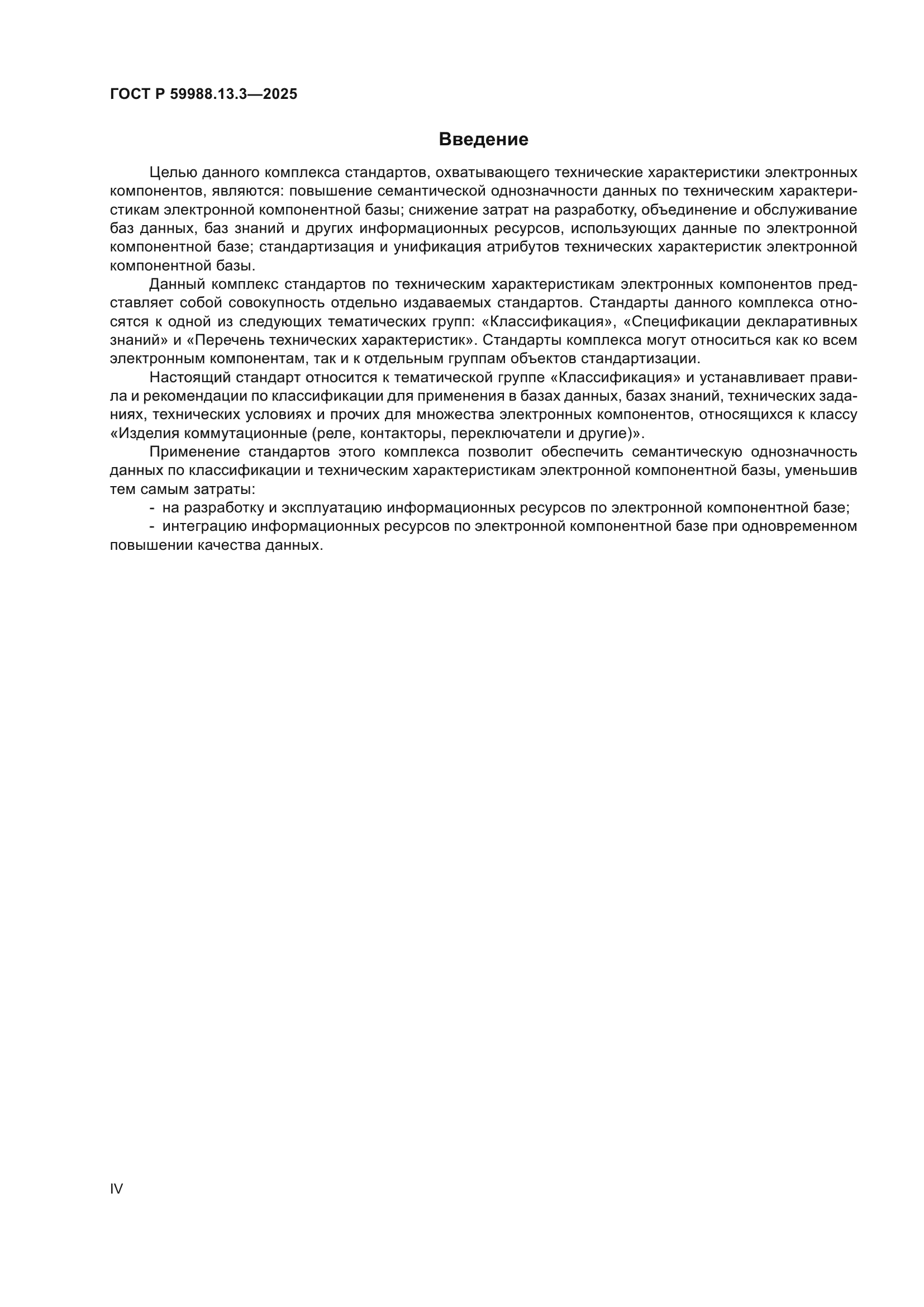 | Название рус.: | Системы автоматизированного проектирования электроники. Информационное обеспечение. Технические характеристики электронных компонентов. Изделия коммутационные (реле, контакторы, переключатели и другие). Классификация | | Название англ.: | Electronics automated design systems. Information support. Technical characteristics of electronic components. Switching products (relays, contactors, switches and other). Classification | | Дата актуализации текста: | 01.01.2026 | | Дата актуализации описания: | 01.01.2026 | | Дата издания: | 01.12.2025 | | Дата введения: | 01.12.2025 | | Нормативные ссылки: | ГОСТ 9098-78; ГОСТ 16022-83; ГОСТ 16121-86; ГОСТ 17499-82; ГОСТ 17703-72; ГОСТ 19350-74; ГОСТ 22614-77; ГОСТ 22719-77; ГОСТ 25903-83; ГОСТ 27888-88; ГОСТ 28811-90; ГОСТ 29011-91;ГОСТ IEC 60050-151-2014;ГОСТ IEC 60050-441-2015;ГОСТ IEC 60050-442-2015;ГОСТ IEC 60050-444-2014;ГОСТ IEC 60050-445-2014;ГОСТ IEC 60050-447-2014;ГОСТ IEC 61439-1-2013;ГОСТ IEC 61810-1-2013; ГОСТ Р 52565-2006; ГОСТ Р 55682.9-2013; ГОСТ Р 59988.00.0; ГОСТ Р 59988.13.2 | | Область применения: | Настоящий стандарт предназначен для информационного обеспечения при разработке баз данных (БД), баз знаний (БЗ), технических заданий (ТЗ), технических условий (ТУ) и позволяет обеспечить семантическую однозначность данных по классификации электронной компонентной базы (ЭКБ). Настоящий стандарт устанавливает правила и рекомендации по применению в БД, БЗ, ТЗ, ТУ и прочего: - классификации ЭКБ; - классификационных признаков части/раздела классификатора ЭКБ. Настоящий стандарт не распространяется на рассмотрение всех проблем классификации и терминологии технических характеристик ЭКБ и разработан в развитие требований государственных, отраслевых стандартов и других руководящих документов по ЭКБ | |
