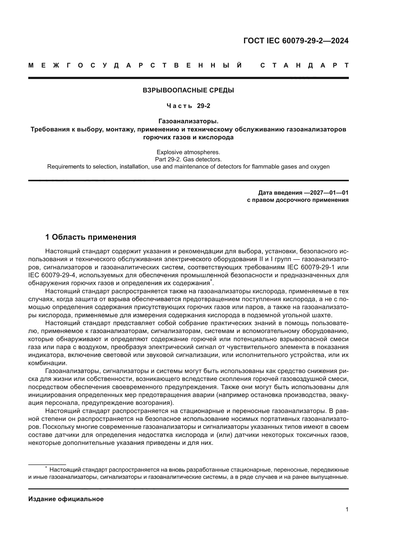 | Название рус.: | Взрывоопасные среды. Часть 29-2. Газоанализаторы. Требования к выбору, монтажу, применению и техническому обслуживанию газоанализаторов горючих газов и кислорода | | Название англ.: | Explosive atmospheres. Part 29-2. Gas detectors. Requirements to selection, installation, use and maintenance of detectors for flammable gases and oxygen | | Дата актуализации текста: | 01.01.2026 | | Дата актуализации описания: | 01.01.2026 | | Дата регистрации: | 31.01.2024 | | Дата издания: | 02.12.2025 | | Дата введения: | 01.01.2027 | | Взамен: | ГОСТ IEC 60079-29-2-2013 | | Аутентичен стандартам: | IEC 60079-29-2(2015) | | Нормативные ссылки: | IEC 60079-0;IEC 60079-10-1(2020);IEC 60079-10-2;IEC 60079-13;IEC 60079-17;IEC 60079-19;IEC 60079-29-1(2007);IEC 60079-29-4;IEC 61285 | | Область применения: | Настоящий стандарт содержит указания и рекомендации для выбора, установки, безопасного использования и технического обслуживания электрического оборудования II и I групп — газоанализаторов, сигнализаторов и газоаналитических систем, соответствующих требованиям IEC 60079-29-1 или IEC 60079-29-4, используемых для обеспечения промышленной безопасности и предназначенных для обнаружения горючих газов и определения их содержания. Настоящий стандарт распространяется также на газоанализаторы кислорода, применяемые в тех случаях, когда защита от взрыва обеспечивается предотвращением поступления кислорода, а не с помощью определения содержания присутствующих горючих газов или паров, а также на газоанализаторы кислорода, применяемые для измерения содержания кислорода в подземной угольной шахте. Настоящий стандарт представляет собой собрание практических знаний в помощь пользователю, применяемое к газоанализаторам, сигнализаторам, системам и вспомогательному оборудованию, которые обнаруживают и определяют содержание горючей или потенциально взрывоопасной смеси газа или пара с воздухом, преобразуя электрический сигнал от чувствительного элемента в показания индикатора, включение световой или звуковой сигнализации, или исполнительного устройства, или их комбинации. Газоанализаторы, сигнализаторы и системы могут быть использованы как средство снижения риска для жизни или собственности, возникающего вследствие скопления горючей газовоздушной смеси, посредством обеспечения своевременного предупреждения. Также они могут быть использованы для инициирования определенных мер предотвращения аварии (например остановка производства, эвакуация персонала, предупреждение возгорания) | |