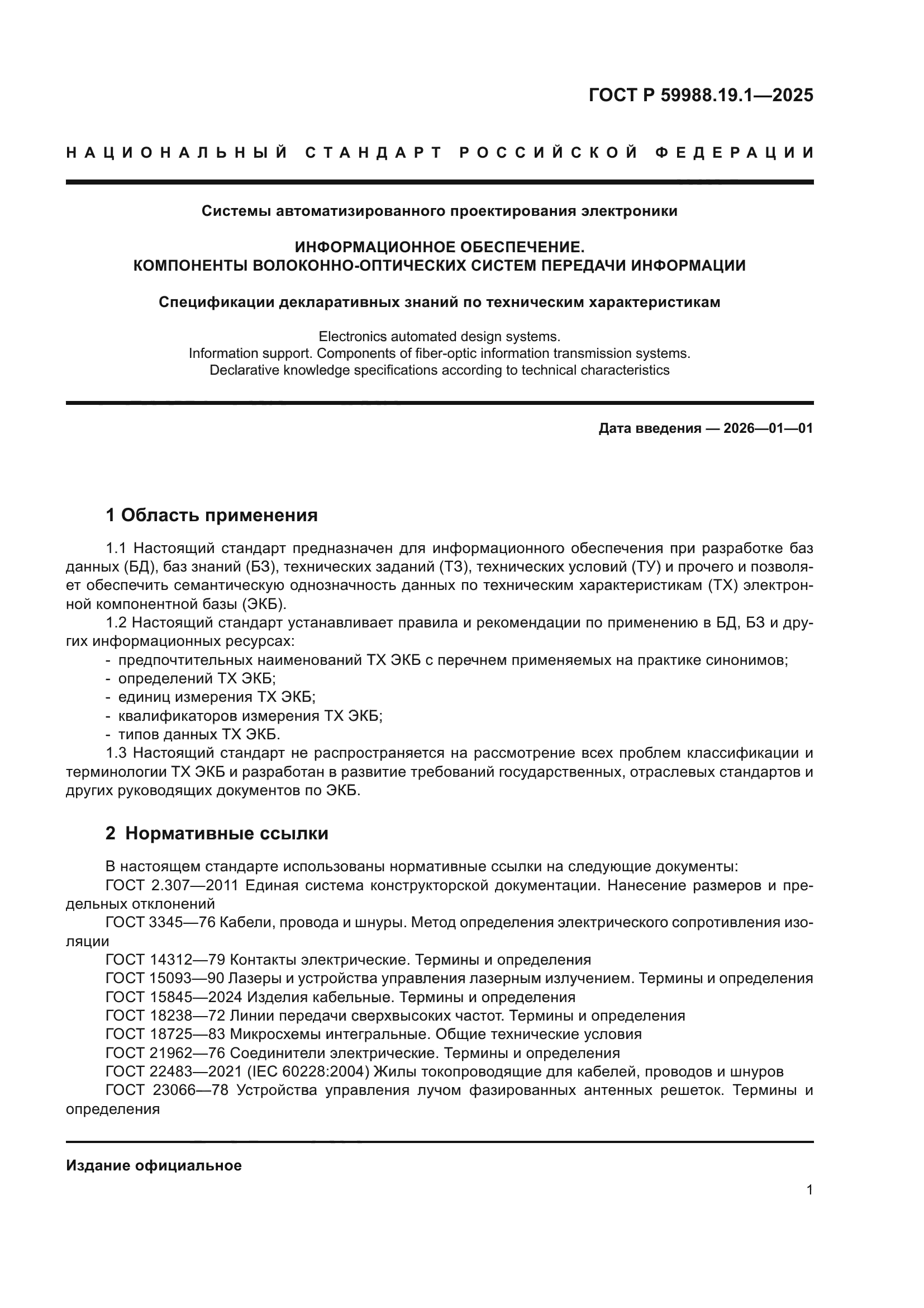 | Название англ.: | Electronics automated design systems. Information support. Components of fiber-optic information transmission systems. Declarative knowledge specifications according to technical characteristics |