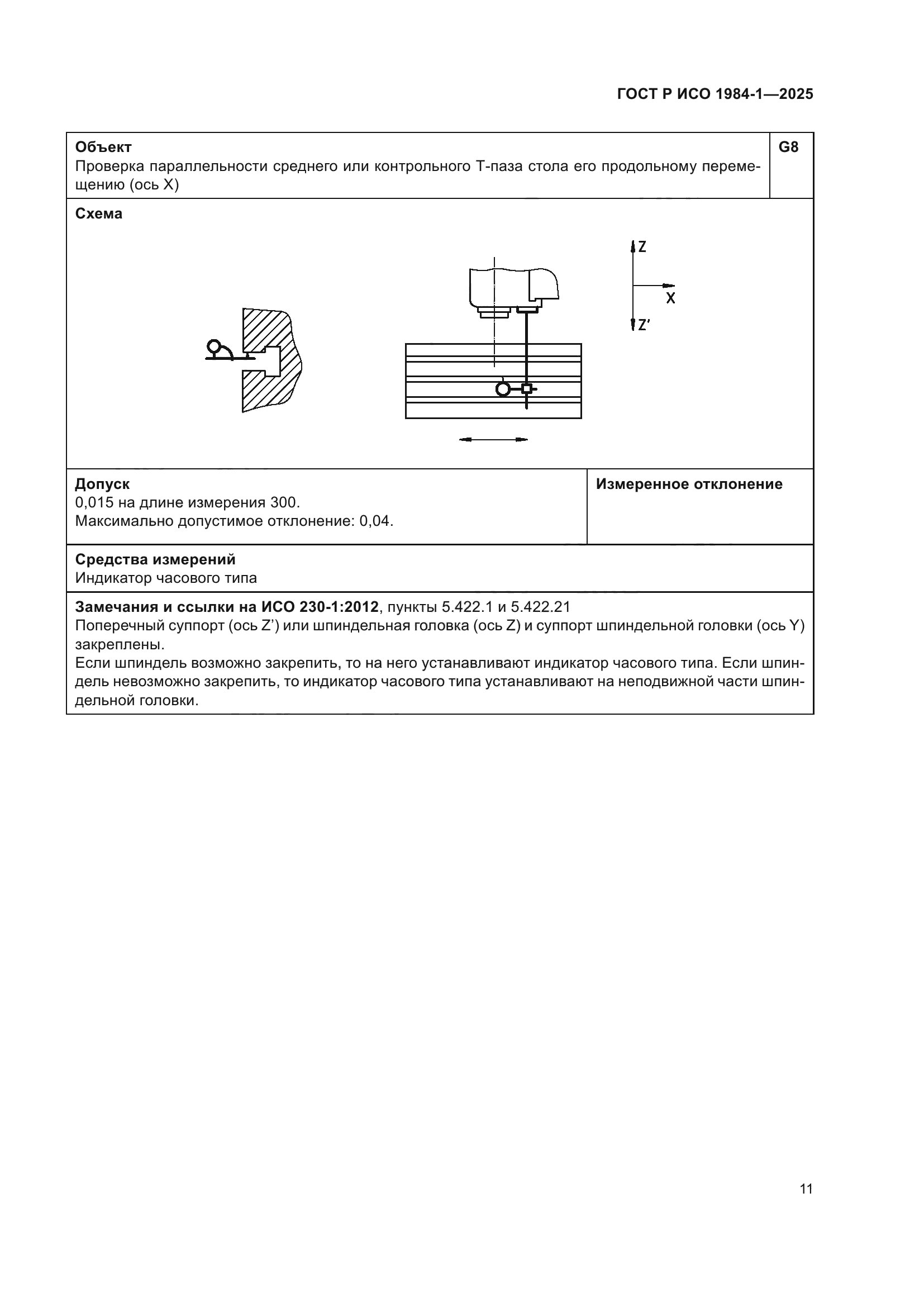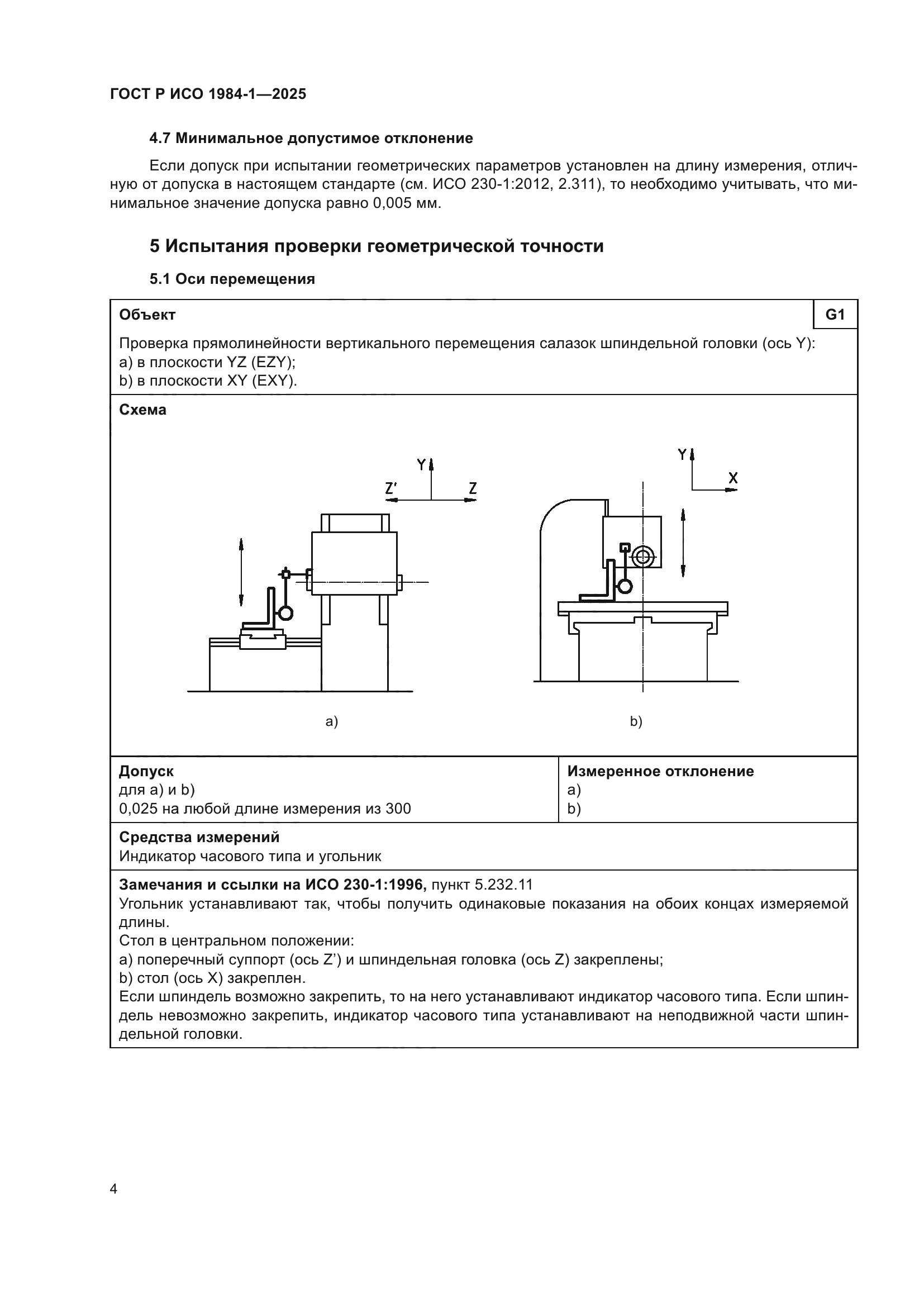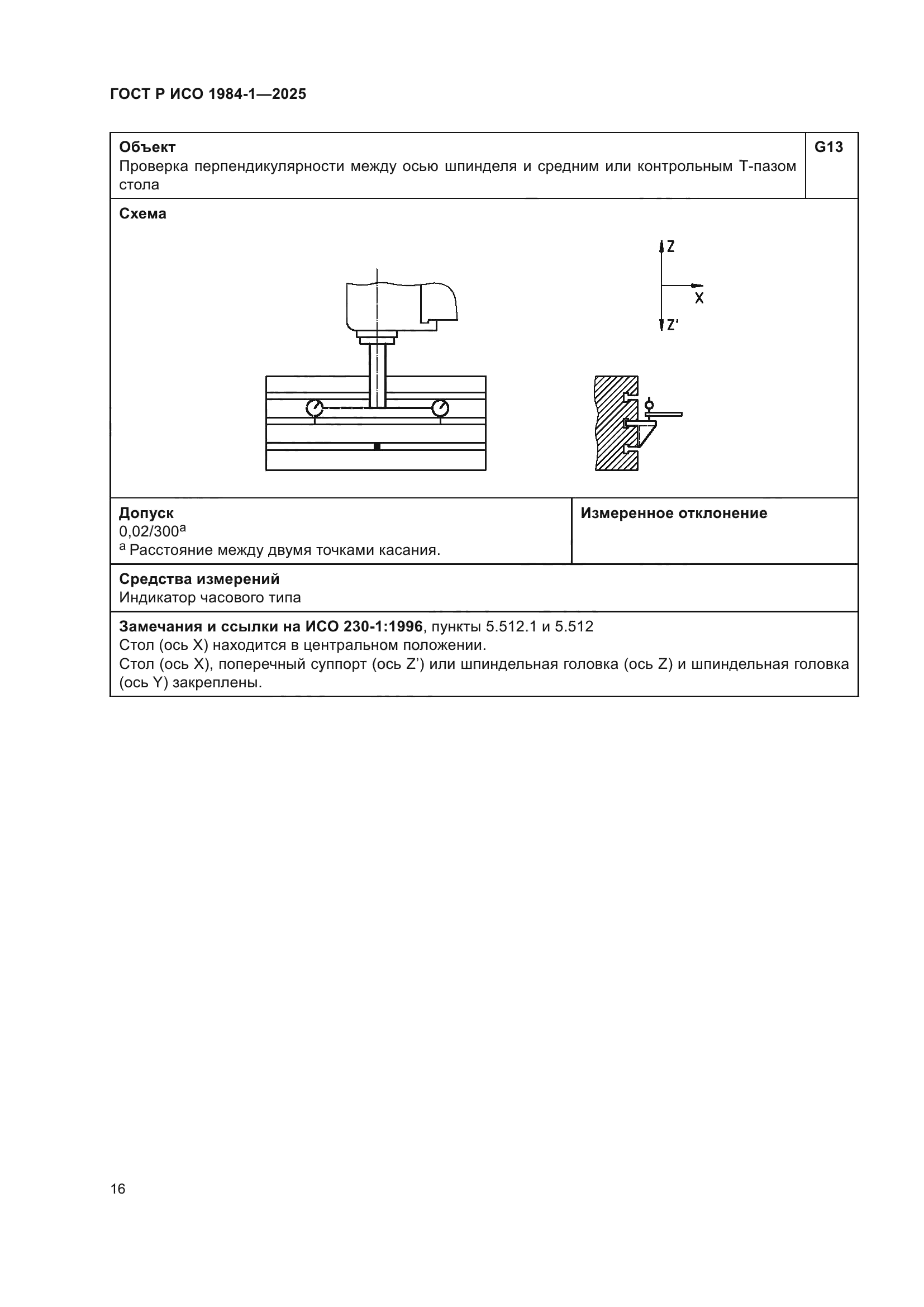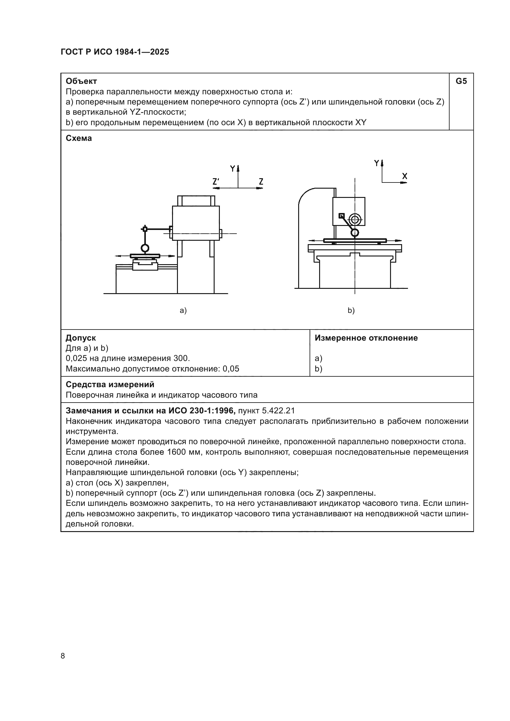 | Название рус.: | Условия испытаний фрезерных станков с ручным управлением со столом постоянной высоты. Проверка точности. Часть 1. Станки с горизонтальным шпинделем | | Название англ.: | Test conditions for manually controlled milling machines with table of fixed height. Testing of the accuracy. Part 1. Machines with horizontal spindle | | Дата актуализации текста: | 01.01.2026 | | Дата актуализации описания: | 01.01.2026 | | Дата издания: | 21.11.2025 | | Дата введения: | 01.07.2026 | | Аутентичен стандартам: | ISO 1984-1:2001 | | Нормативные ссылки: | ISO 230-1:2012 | | Область применения: | Настоящий стандарт совместно с ИСО 230-1 устанавливает требования к испытаниям по проверке геометрической точности и к испытаниям при механической обработке фрезерных станков общего назначения и нормальной точности со столом фиксированной высоты и горизонтальным шпинделем. Настоящий стандарт также устанавливает соответствующие допуски для описанных выше испытаний. В настоящем стандарте рассматриваются только вопросы проверки точности станка. Настоящий стандарт не применяется ни к испытаниям при работе станка (вибрации, ненормальные шумы, скачкообразные движения компонентов станка и т.д.), ни к характеристикам станка (скорости, подачи и т.д.), которые проверяют до начала испытания точности. Настоящий стандарт определяет терминологию, используемую для обозначения основных элементов станка, и указывает на обозначение осей в соответствии с ИСО 841 [1] | |