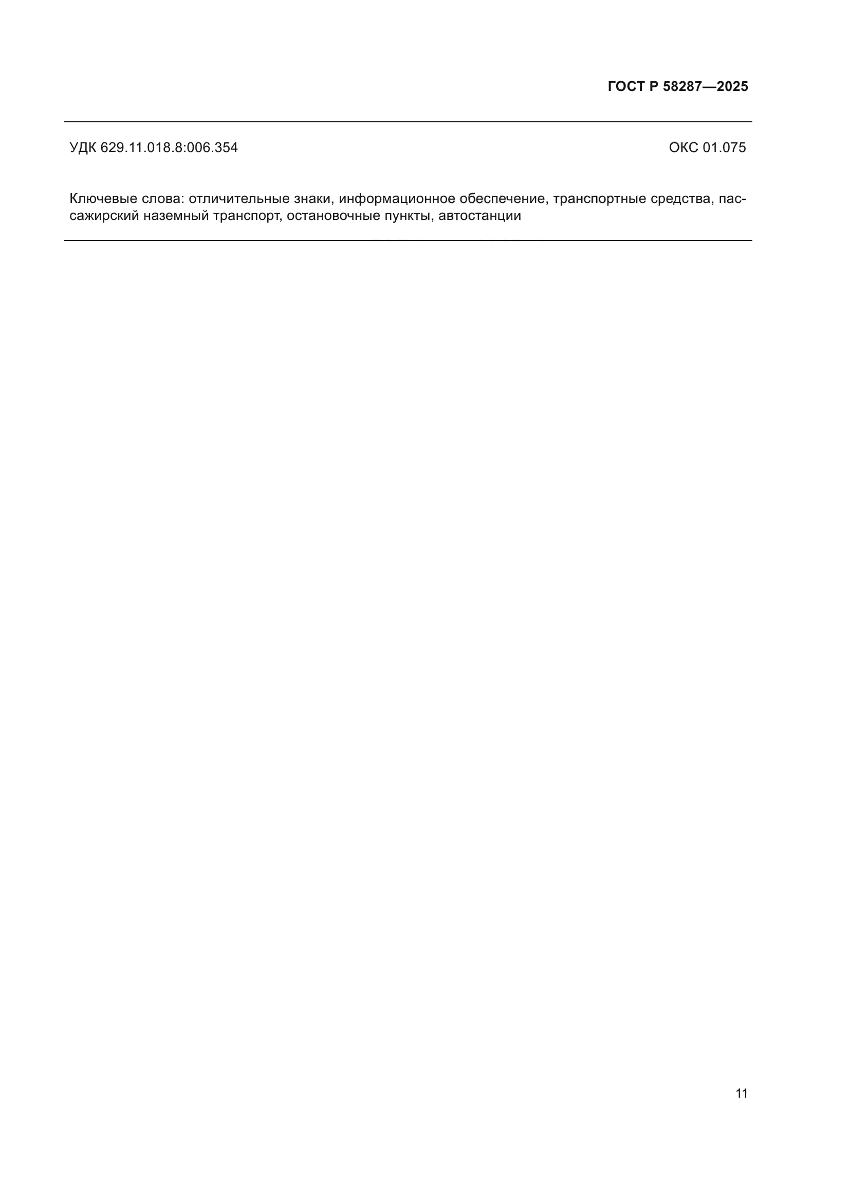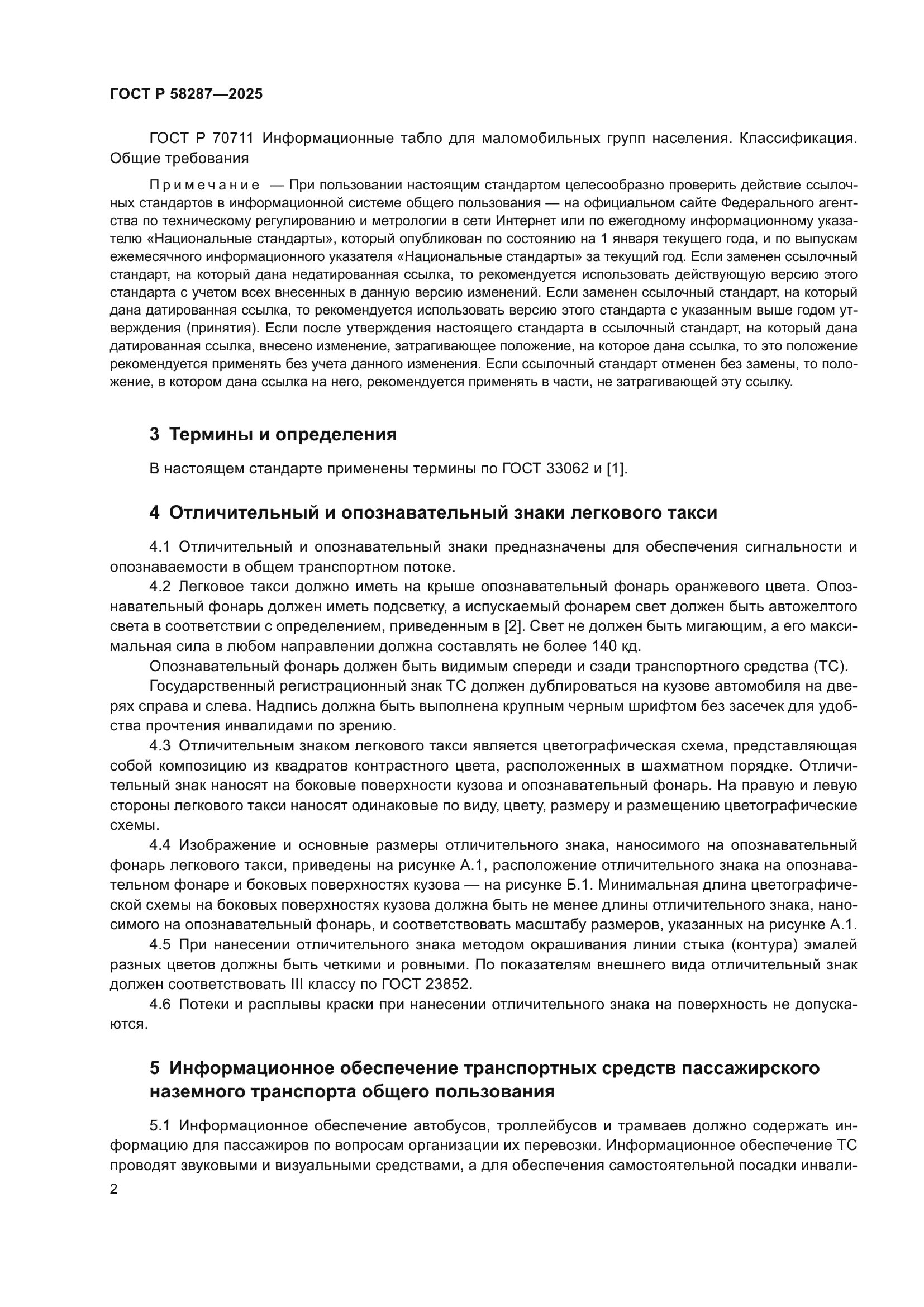 | Название рус.: | Отличительные знаки и информационное обеспечение транспортных средств пассажирского наземного транспорта, остановочных пунктов и автостанций. Общие технические требования | | Название англ.: | Distinctive signs and information support for vehicles of passenger overland transport, stops and stations. General technical requirements | | Дата актуализации текста: | 01.01.2026 | | Дата актуализации описания: | 01.01.2026 | | Дата издания: | 15.12.2025 | | Дата введения: | 01.07.2026 | | Взамен: | ГОСТ Р 58287-2018 | | Нормативные ссылки: | ГОСТ 15150; ГОСТ 23852; ГОСТ 33062; ГОСТ Р 51671; ГОСТ Р 52131; ГОСТ Р 52290-2024; ГОСТ Р 52875; ГОСТ Р 59431; ГОСТ Р 59812; ГОСТ Р 70711 | | Область применения: | Настоящий стандарт распространяется на отличительные знаки легкового такси и информационное обеспечение транспортных средств пассажирского наземного транспорта общего пользования и устанавливает общие требования к отличительным знакам, указателям и схемам маршрутов, к знакам особых предписаний, информационным табличкам автобусов, троллейбусов, трамваев, их остановочных пунктов и к информационному оформлению автостанций и автовокзалов. Настоящий стандарт применяется для адаптации транспортных средств пассажирского автомобильного транспорта и городского наземного электрического транспорта, а также для оформления автостанций и автовокзалов для обеспечения доступности маломобильных групп населения | |